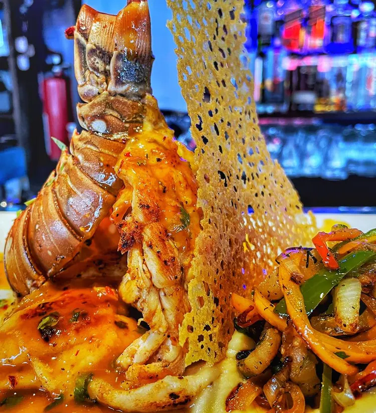 Char-grilled Lobster tail w/mango habanero chilli sauce & col, salad.